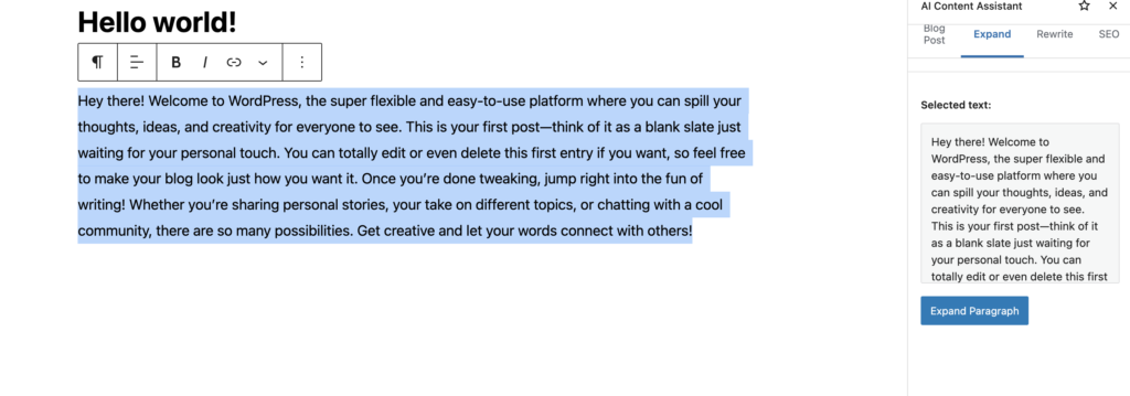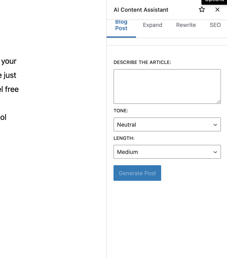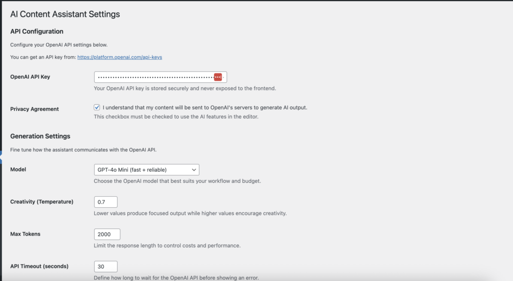 AI Content Assistant integrates OpenAI directly inside the Gutenberg editor, delivering fast on-demand content generation, rewriting, SEO ideas, and paragraph expansion without leaving WordPress. The plugin is designed for marketplace requirements: clean code, translation readiness, unbranded UI, and privacy controls suitable for client projects.